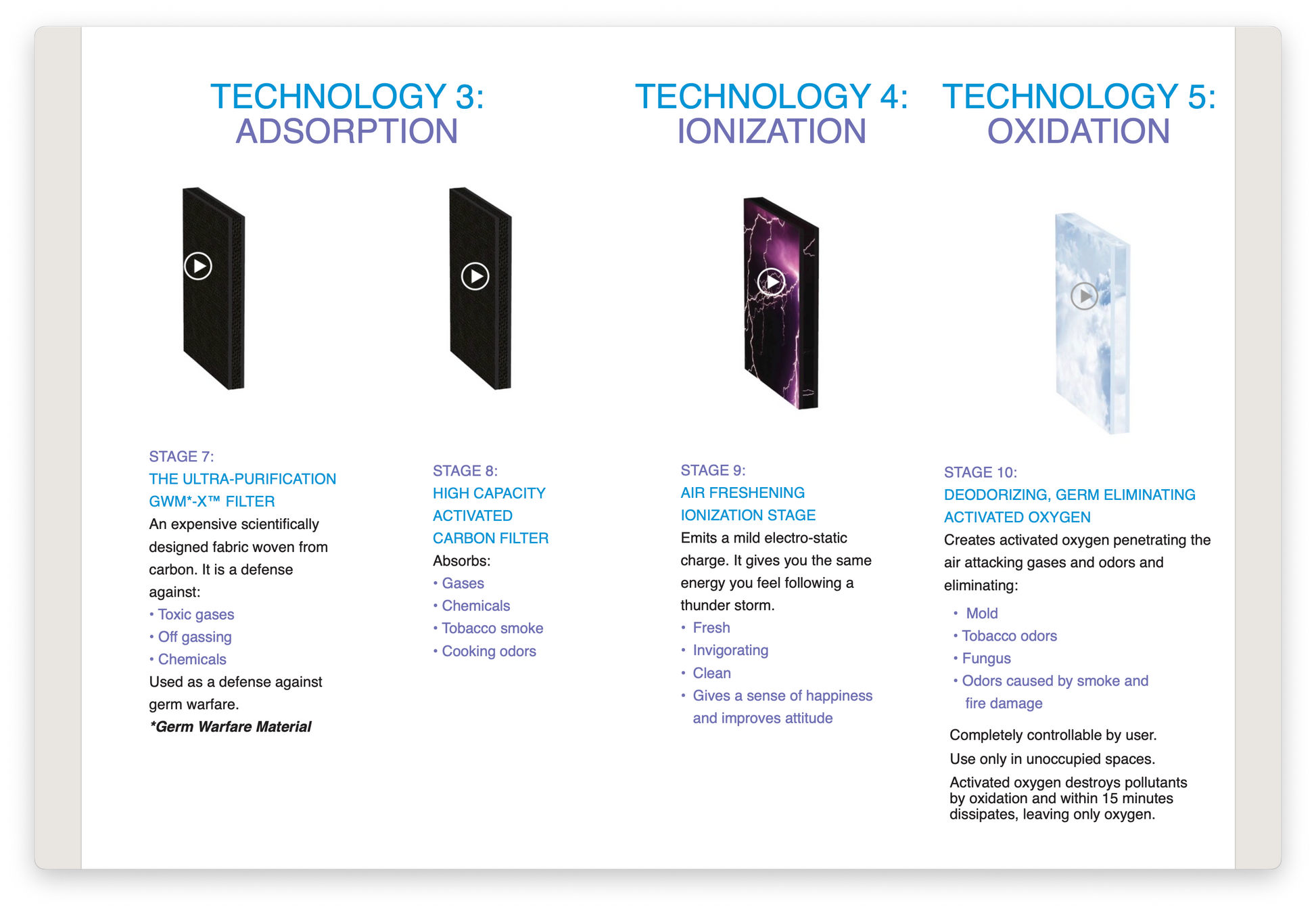 Cutting edge 10 Stage Air Filtration System. Designed to work within 2800 sqft area. Addresses all 3 main contaminant groups. Special patented technology allows you to utilize Ozone, Ionization, and Neutralizing simultaneously.