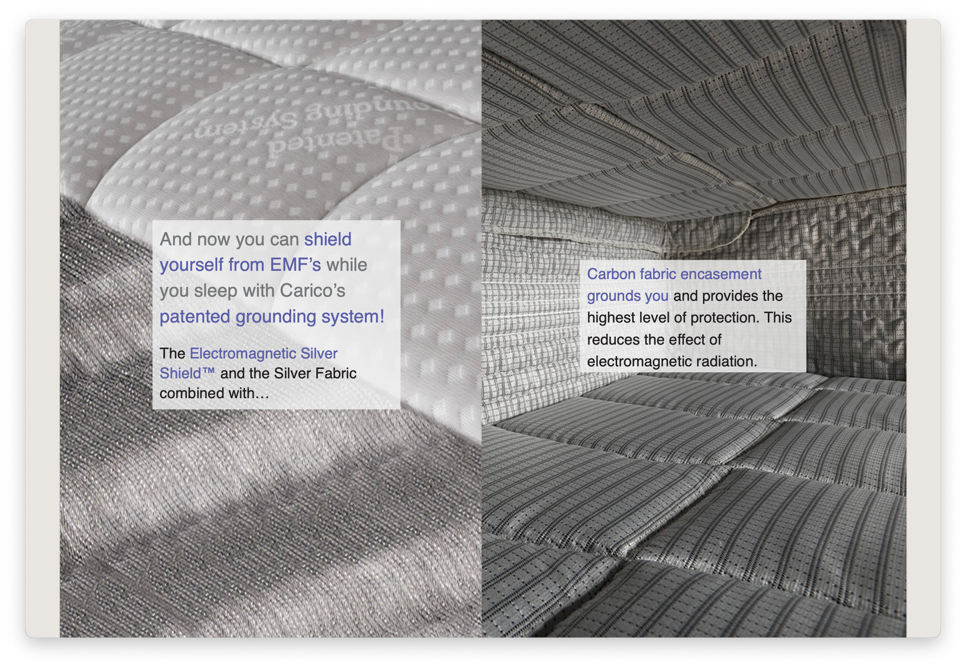 The most groundbreaking conductive earthing grounding sleep technology on the market, Wrap around woven Silver and Carbon fiber encapsulating the worlds first non-toxic fire retardant foam ionized with silver.